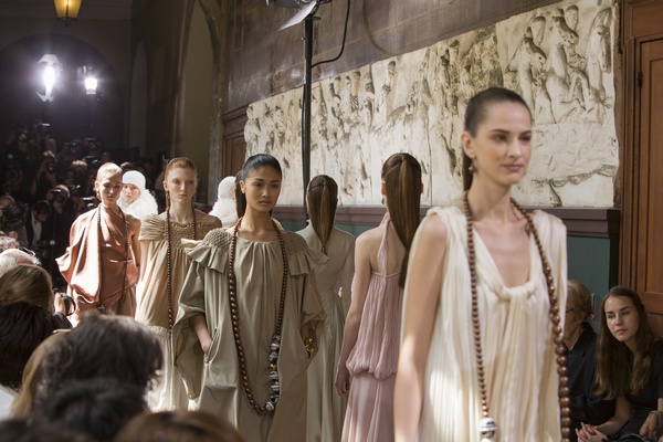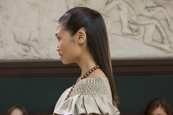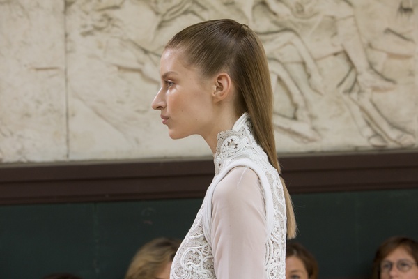 Nella sfilata di Christophe Josse abbiamo ammirato tutta la tavolozza dei colori invernali: avorio, alabastro e sfumature di bianco si alternano nei tessuti e si mescolano con i colori naturali dei capelli che vanno dal rosso rame al castano chiaro fino al biondo miele. Per realizzare la doppia coda che vedete nella gallery, seguite i nostri consigli.