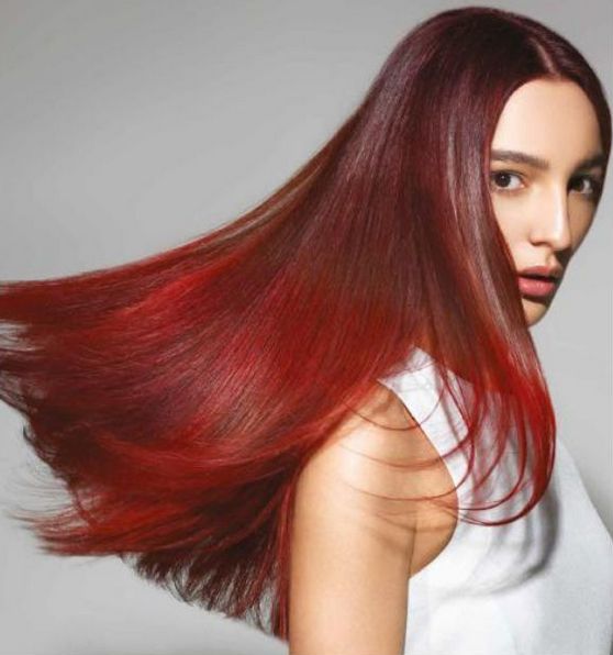 1) Ombrè rosso. Si tratta di dividere un due la capigliatura creando un effetto ombrè hair che si declina in due diverse tonalità di rosso, la tonalità 5,62 su radici e media lunghezza e la tonalità 6,66 per le punte. Il contrasto tra un rosso profondo e uno più ricco rende la capigliatura molto elegante.