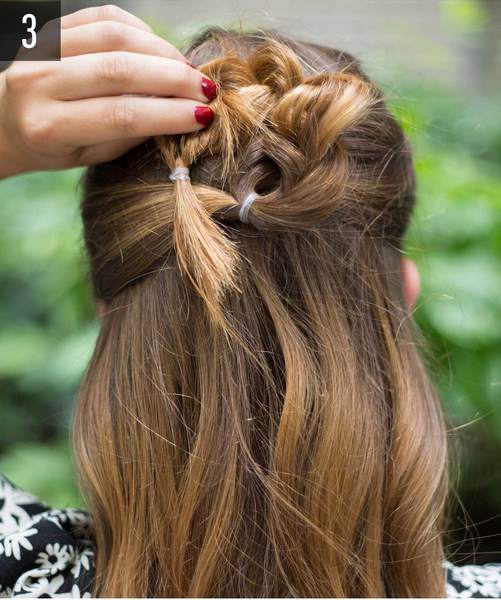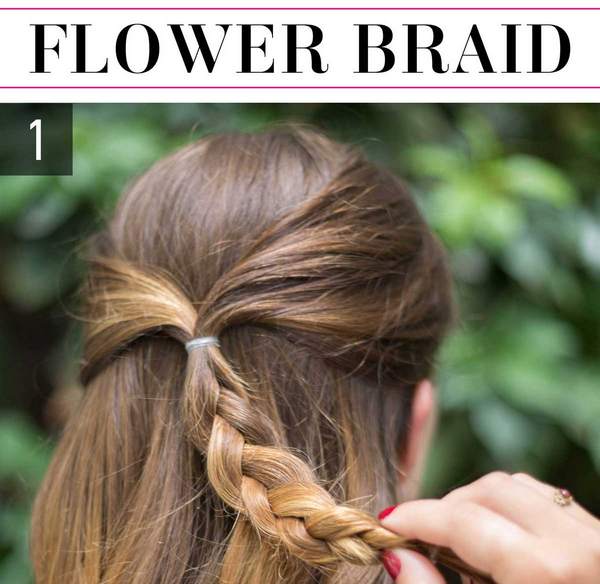 Step 2. Con le lunghezze della mezza coda realizzate una treccina normale a tre ciocche. Cercate di intrecciare quanto più a lungo è possibile perchè più lunga è la treccia più corposo sarà il fiore alla fine.