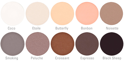 La Elegantissimi si compone di 10 ombretti nude in finish opachi o satinati: Coco, bianco puro opaco, Etoile, color burro chiarissimo satinato, Butterfly, color crema opaco, Bonbon, color albicocca chiaro opaco, Noisette, nocciola chiaro satinato, Smoking, grigio tortora freddo vellutato, Peluche, grigio beige talpa luminoso, Croissant, marrone caldo perlato, Espresso