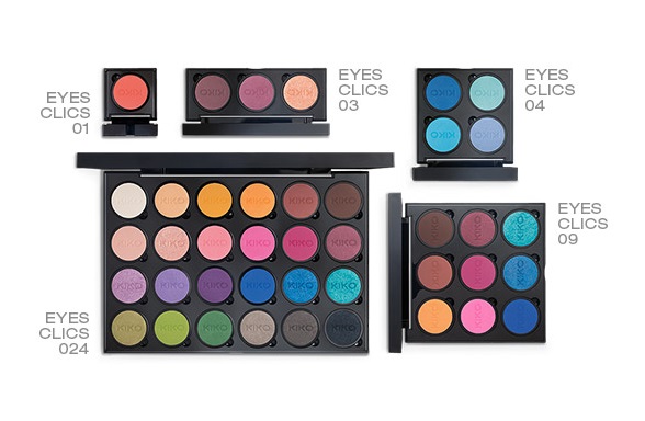 Le palette personalizzabili di Kiko, battezzate dal marchio con il nome di Palette Clics System, sono studiate per personalizzare in un solo astuccio da uno a più ombretti che potranno essere acquistati separatamente e poi inseriti nella palette scelta. Tra le palette personalizzabili, Kiko ha presentato astucci da uno, tre, quattro, nove o ventiquattro posizioni, palette che sono in vendita un prezzo diverso, ma comunque molto vantaggioso: la palette da un colore è in vendita a 1,90 euro, la palette da tre colori è in vendita a 3,90 euro, 4,90 euro per la palette da quattro colori, un astuccio da nove colori è in vendita a 9,90 euro e al prezzo (secondo noi molto vantaggioso) di 15,90 euro è in vendita la palette da ventiquattro colori.