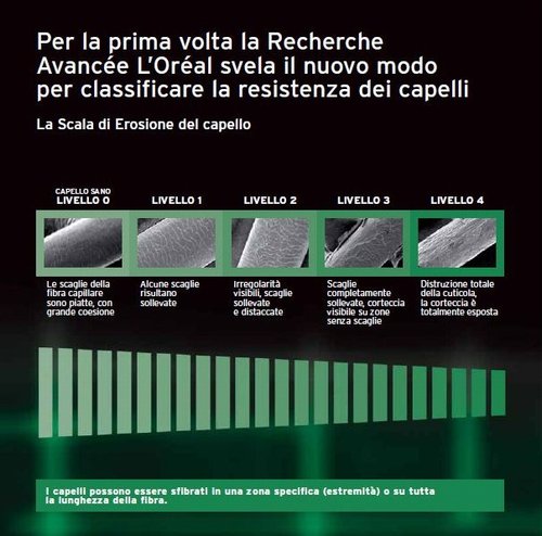 Per la prima volta la Recherce Anvancée L’Orèal ha ideato un metodo per classificare il livello di erosione dei capelli, con la “Scala di Erosione”. La scala prevede 5 livelli. Al livello zero si collocano i capelli sani, che hanno le scaglie della fibra piatte e molto coese. Al livello 1 i capelli in cui solo alcune scaglie sono sollevate. I livelli due, tre e quattro sono quelli che rappresentano capelli con irregolarità visibili, scaglie sollevate o completamente staccate e corteccia visibile o completamente esposta all’erosione.