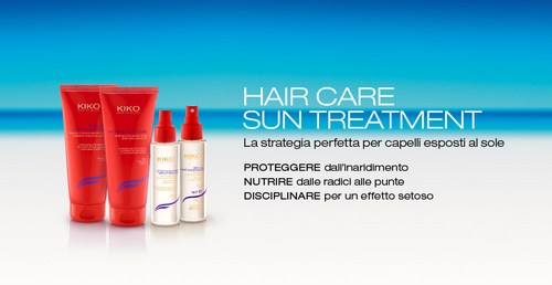 L’ultima novità di casa Kiko è la linea di prodotti per capelli Hair Care Sun Treatment: 4 prodotti per la cura dei capelli lungamente esposti al sole, ideali per proteggerli dall’inaridimento causato dall’azione dei raggi Uv e della salsedine. Raggi UV, salsedine, bagni in piscina e al mare, vento e lavaggi frequenti possono essere un mix pericoloso per la salute della chioma. Il periodo estivo sottopone o capelli a notevoli stress, danneggiandone la struttura e rendendoli aridi, opachi e ribelli. La protezione dei capelli dunque è fondamentale e deve cominciare dalla routine del lavaggio, per essere completata con prodotti specifici che proteggano i capelli anche durante l’esposizione al sole e i bagni al mare.