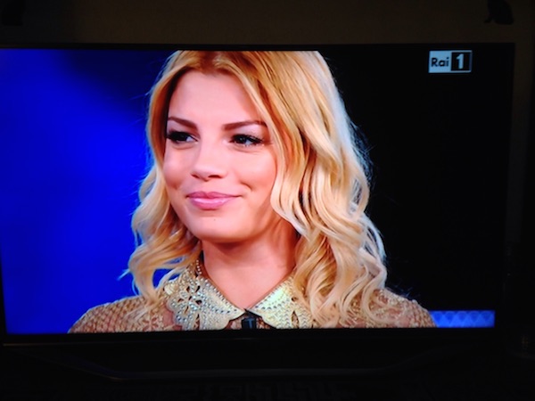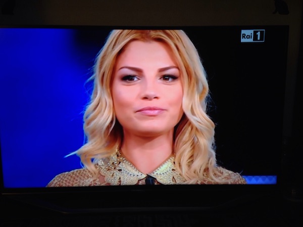Niente incarnato da bambola di porcellana come Arisa: Emma ha una carnagione dorata, naturale e molto sana che i truccatori sono riusciti a valorizzare al meglio dosando con parsimonia il fondotinta (probabilmente un fluido leggero e luminoso come Studio Face and Body di Mac Cosmetics), calibrando l’utilizzo del blush (toni naturali e rosa pesca) e utilizzando con intelligenza un illuminante nei punti strategici del viso.