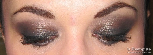 Nell’angolo esterno ho dato profondità creando una sorta di V nero carbone (ho usato Carbon di Mac) e insistendo nella piega. A questo punto ho proceduto creando un tratto di matita nera sia sopra che sotto. Sulla rima inferiore ho ripassato la linea di matita con un pennellino angolato dopo aver prelevato un altro po’ di nero intenso. Sull’arcata sopracciliare solo un colore neutro e chiaro. Per il mascara ho scelto Faux Cils Shocking nero di Yves Saint Laurent.
