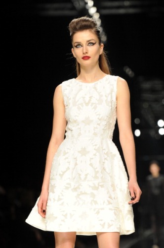 Scelta molto simile per la donna virago, che somiglia a una moderna guerriera in discoteca che ama i corpetti e il vedo-non-vedo, di John Richmond: le labbra, in questo caso, assumono una sfumatura più gioiosa e meno dark rispetto a Gucci, assumendo una nuance che vira allo scarlatto. Sempre di rosso parliamo, ma stavolta è palesemente esibizionista, meno misterioso e gotico. Capelli tirati all’indietro e gonfi davanti e occhi felini, enfatizzati da un tratto di eyeliner spesso ed evidente che termina a coda verso l’alto.