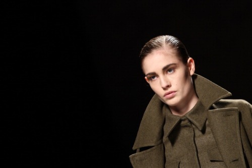 Per Max Mara una donna completamente diversa calca la passerella: l’incarnato è vellutato, opaco dall’epidermide agli occhi fino alle labbra: il minimalismo è portato alle estreme conseguenza. Per Max Mara saremo dei soldati iper chic che non hanno tempo e voglia di concedersi troppe frivolezze, visti i tempi bui che corrono. E così vediamo occhi taupe e panna senza mascara, gote definite da uno sculpting sapiente e deciso e labbra matte, color carne, senza nessun accenno di colore.