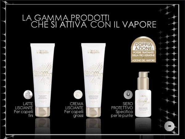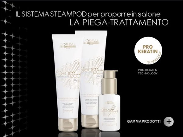 La nuova piastra a vapore Steampod L’Orèal ha un meccanismo di diffusione del vapore più intenso ed efficace. La temperatura di azione si può impostare a seconda delle caratteristiche dei capelli, da 140° fino a 210° per i capelli più spessi. La piastra a vapore è molto più leggera e maneggevole perchè è più sottile e il rilascio di vapore è immediato, praticamente all’accensione della piastra. Il procedimento per la piega invece resta uguale. Il parrucchiere applica la crema lisciante alla pro-keratina sui capelli umidi, asciuga al 100% con il phon, poi applica il siero concentrato sulle punte e infine disciplina i capelli con la piastra a vapore Steampod.