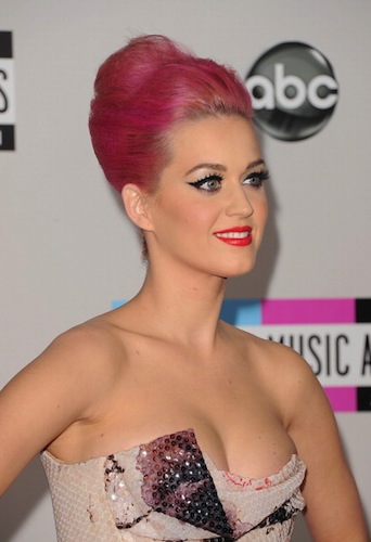 Katy Perry, ovvero la donna che riesce a stare divinamente sia con i capelli color turchini sia color rosa cipria, pone l’accento sull’intensità di entrambe le parti del viso: ciglia finte a ciuffetti, eyeliner esagerato, dal tratto molto spesso e disegnato con decisione verso l’alto e, infine, labbra glossy con un rossetto rosso-corallo.