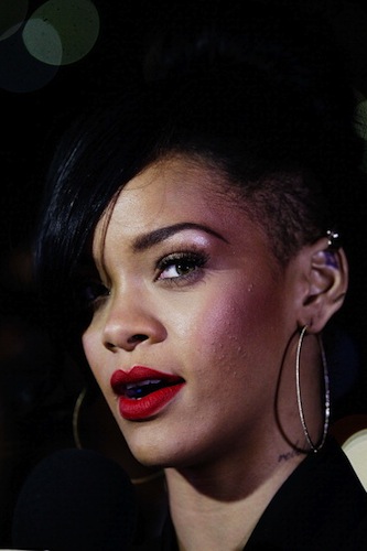 Rihanna sceglie una tonalità di rosso intenso color mela: lo vuole matte, per le sue labbra polpose e ben disegnate e la scelta è azzeccata, perché bilancia la luminosità degli occhi, che sono ultra shimmer ma neutri. Il tratto di eyeliner è sapientemente disegnato con la celebre coda all’insù che allarga lo sguardo e lo rende più magnetico e sensuale (è questa la caratteristica dell’occhio a gatta). Scegliete questa tonalità di lipstick se siete scure, olivastre o ambrate: come vedete il risultato è strepitoso!