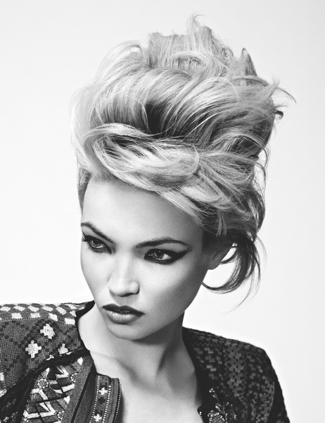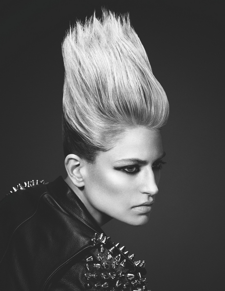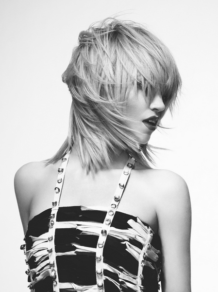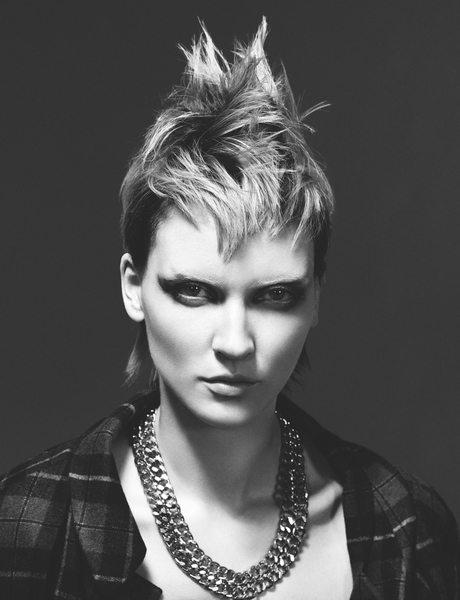 Non sono solo corti i tagli di questa collezione. Punkettes ha al suo interno anche tagli medi e lunghi, dove il finish glamour e vaporoso si azzuffa con l’abbigliamento da ribelle. I tocchi più estremi sono quelli dei capelli corti, che accennano allo stile anni ’70 esasperando le tendenze punk-rock: i volumi sono esagerati, le creste altissime, i tagli scalati e pettinati sulla fronte con acconciature fintamente trascurate.
