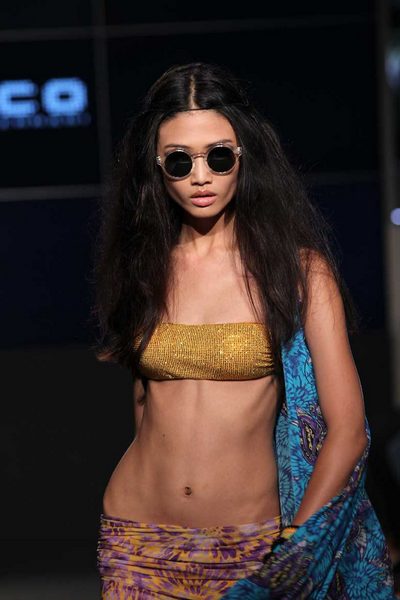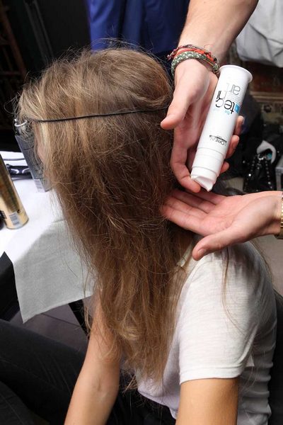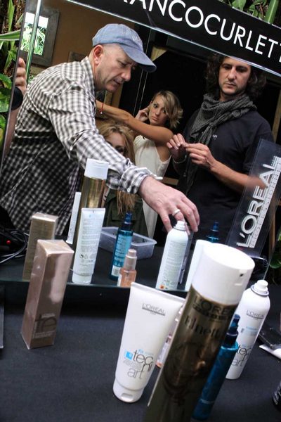 Per dare risalto alle stampe vivaci e floreali e ai costumi da bagno impreziositi dai gioielli, l’hair stylist Franco Curletto ha creato pettinature strutturate ma libere, in cui il volume è stato studiato per ottenere l’aspetto della chioma selvaggia e dei capelli asciutti dopo un bagno al mare. L’ effetto visivo è quello della salsedine, assolutamente matt. Per ottenere questo risultato è stato applicato il gel Tecni Art Fix Move di L’Oréal Professionnel sui capelli umidi. Poi si applica lo spray Quick Tease15 di Redken, per ottenere capelli cotonati ed un effetto matt. Per enfatizzare l’aspetto incolto e hippie, l’hair stylist Franco Curletto ha pensato a una doppia cotonatura esterna, che rende lo stile ancora più anni 70. L’ effetto bagnato, leggermente lucido di capelli, è stato ottenuto utilizzando lo Spray-a-Porter di Kérastase, che ha dato ai capelli un aspetto “appena emersi dal mare”.