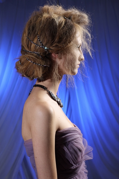 Tutte le acconciature sono ispirate all’artista del 1900 Giovanni Boldini. I capelli sono vaporosi come lana, gli chignon spettinati e spiumati. Tra i capelli trionfano piccole rose, fiori e farfalle di Swarovski per esaltare l’evanescenza delle pettinature e dei tagli.
