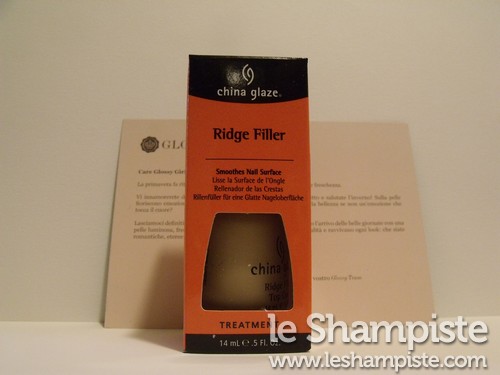 – China Glaze, Ridge Filler Base Coat: Addio applicazioni imperfette, il prodotto della GlossyBox di marzo aiuterà tutte le superfici a ritrovare la perfetta forma di sempre. Il gel, applicato sull’unghia, riempie i dislivelli delle unghie e crea una base uniforme sotto al vostro smalto colorato preferito